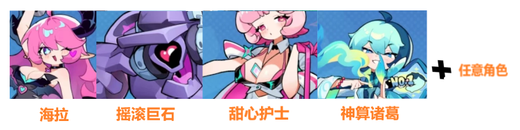 ① 海拉+摇滚巨石+甜心护士+灵活配置:剩余位置优先选辅助如神算诸葛,施加减防减攻Debuff并群攻,最后一个位根据战况选输出、坦克或辅助。